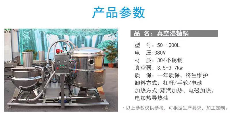 1、真空浸糖鍋以一定壓力的蒸汽為熱源(也可選用電加熱;天然汽、液化汽),真空浸糖鍋具有受熱面積大、熱效率高、加熱均勻、液料沸騰時間短、加熱溫度容易控制等特點。