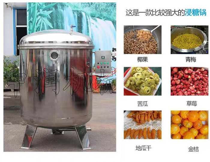 傳統(tǒng)浸糖多采用多次煮制,然后再多次自然浸泡的方法,完成浸糖需48~72小時不等,同時為使果脯含糖均勻,必須不斷攪動果品,這不僅使果脯加工周期長、勞動強度大、衛(wèi)生條件差,而且廢品率高。利用浸糖真空鍋所得產(chǎn)品色澤鮮、果味濃、不結晶、不倒糖、滲糖多、塊形大、出品率高,是取代傳統(tǒng)浸糖工藝的理想設備。同時該設備可適用于多種果脯產(chǎn)品的加工,通用。